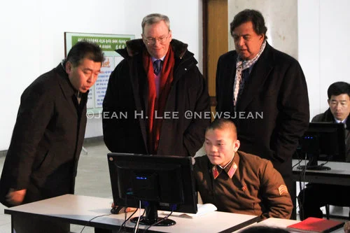 Schmidt and Cohen chatted with students working on HP desktop computers at an "e-library" at the university named after North Korea founder Kim Il Sung. One student showed Schmidt how he accesses reading materials from Cornell University online on a computer with a red tag denoting it as a gift from Kim Jong Il.